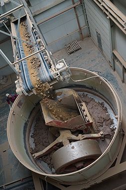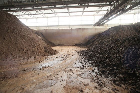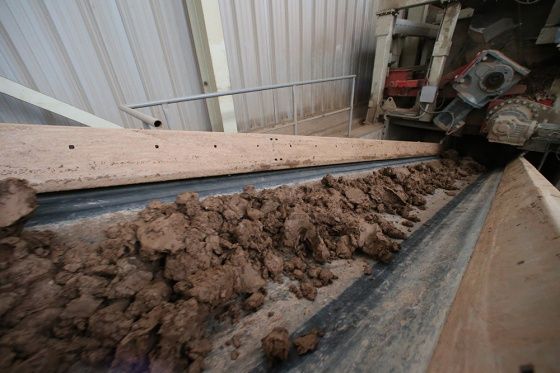 Место где крупные куски породы перемалываются и отправляются в глинохранилище. Здесь происходит процесс ее измельчения и удаления каменистых включений. После этого переработанная глина по транспортерной ленте поступает в глинозапасник в отсеки хранилища на вылежку.